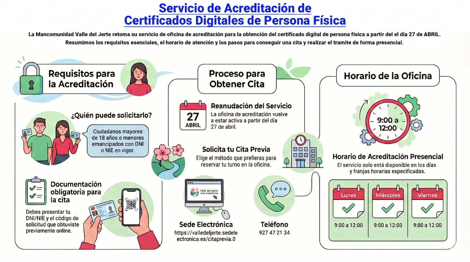 La oficina de acreditación de certificados digitales de la Mancomunidad Valle del Jerte retomará su actividad el próximo lunes 27 de abril.
