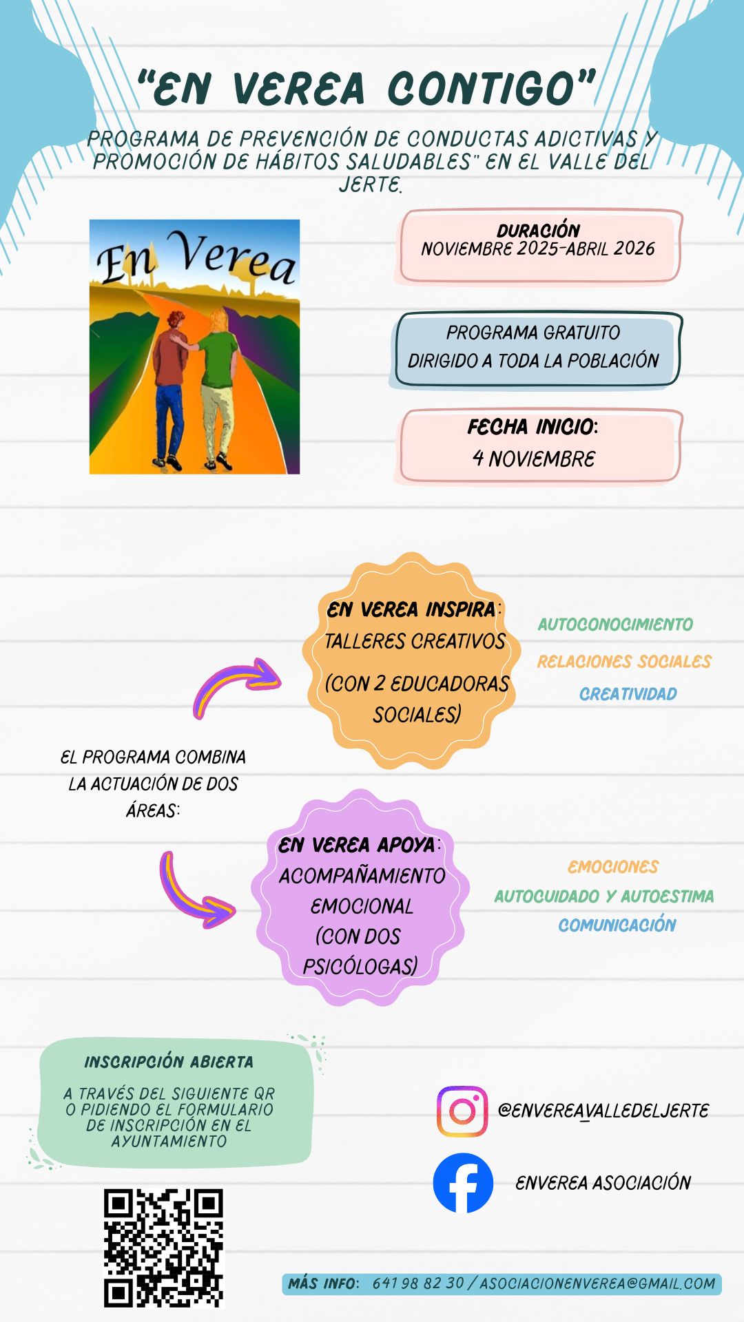 La asociación En Verea abre las inscripciones para el Programa: En Verea Contigo. Sobre Prevención de Conductas Adictivas y Promoción de Hábitos Saludables, dirigido a toda la población. Se tratarán temas como gestión emocional, comunicación sana, establecimiento de límites y creatividad, entre otros.Inicio: 4 de noviembre