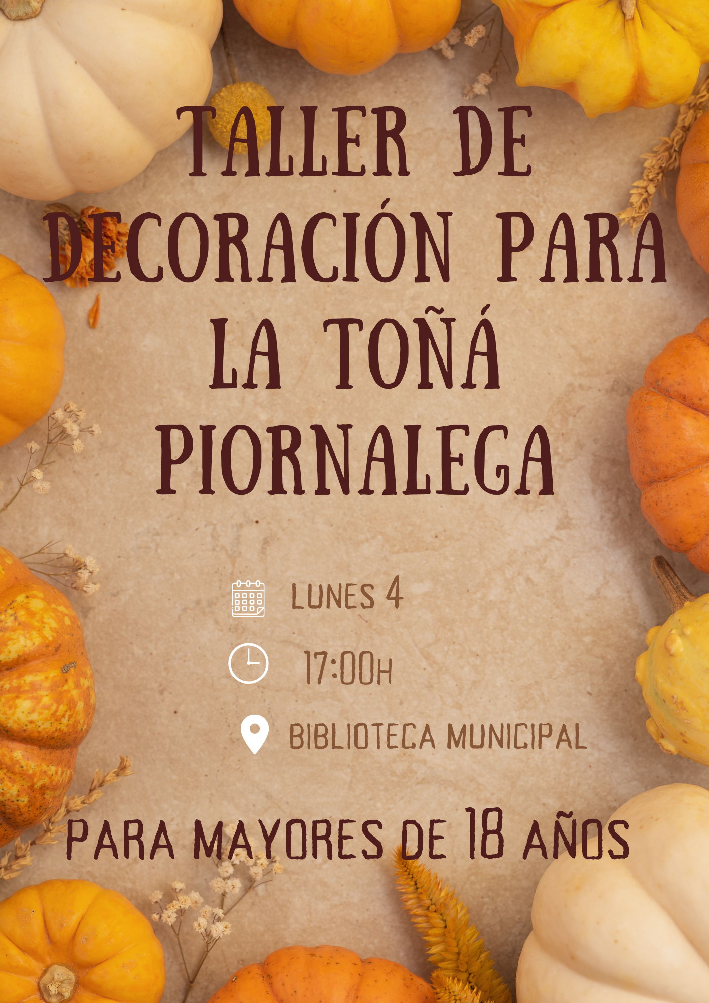 TALLER DECORACIÓN TOÑÁ2024-10-29 13:35:59Info GeneralSe informa que se va a realizar un taller de decoración para la Toñá Piornalega , se llevará a cabo el próximo LUNES 4 a las 17:00h en la Biblioteca Municipal .