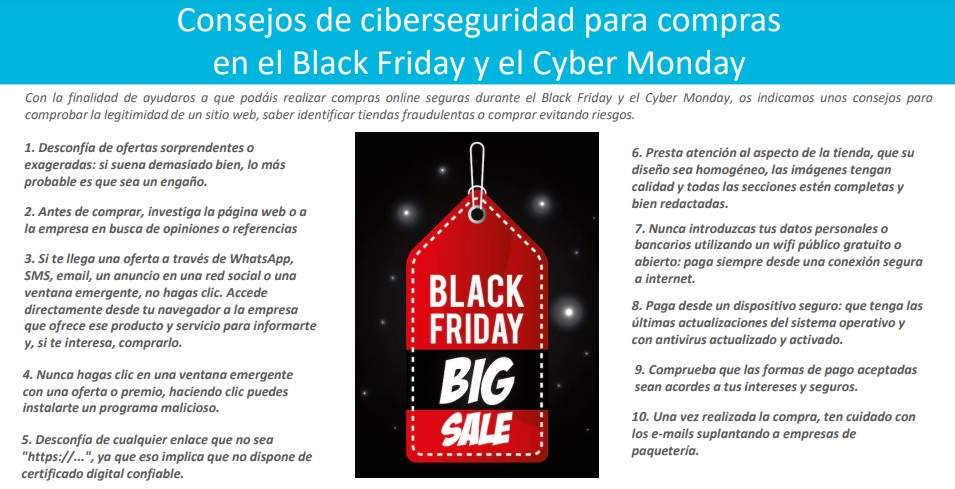 CONSEJOS DE CIBERSEGURIDAD PARA COMPRAS EN EL BLACK FRIDAY Y EL CYBER MONDAY2024-11-05 14:12:39Info GeneralCon la finalidad de ayudar a que podáis realizar compras online seguras durante el Black Friday y el Cyber Monday, os indicamos unos consejos para comprobar la legitimidad de un sitio web, saber identificar tiendas fraudulentas o comprar evitando riesgos.